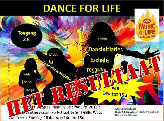 Music For Life, de solidariteitsactie van radiozender Studio Brussel leverde een recordopbrengst op. Ook in Sint-Gillis-Waas was er een actie voor Music For Life. Dance For Life, een initiatief van N-VA Sint-Gillis-Waas en Danscenter Waasland leverde met dans voor kinderen en een professionele dansinitiatie swing, bachata en charleston 400,32 euro op. Dit wordt integraal geschonken aan de VZW Canisha uit Wetteren, die assistentiehonden opleidt voor mensen met een beperking. “Elk jaar nemen we deel aan deze solidariteitsactie” vertelt Vlaams Parlementslid en ondervoorzitter Koen Daniëls (N-VA). “Dit jaar wilde we eens iets origineels doen en kwam Nancy Van Nespen van Danscenter Waasland met het originele idee om een dansinitiatie te organiseren. Met succes, want de bibliotheekzaal was goed gevuld.”