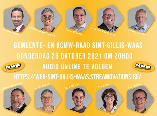 Op donderdag 28 oktober 2021 was er gemeente- en OCMW-raad in onze gemeente. De zitting ging digitaal door omdat er steeds meer corona besmettingen in onze gemeente vastgesteld worden. Op de website van de gemeente kan je de zitting herbekijken, alsook de commissiezitting van maandag 25 oktober 2021, dit alles via volgende link: https://web-sint-gillis-waas.streamovations.be/