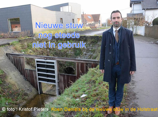 Het lijkt pure kafka en dat is het ook. Een stuw op de Watergang der Hoge Landen kan een half jaar na de realisatie nog altijd niet gebruikt worden omdat een loopbrugje en een zwengel om de klep omhoog en omlaag te laten, ontbreken. Vlaams Volksvertegenwoordiger Koen Daniëls (N-VA) deed de vaststelling toen hij een inspectieronde maakte langs alle overstromingsgevoelige punten in de gemeente. De voorbije dagen stond het waterpeil immers op heel wat plaatsen alarmerend hoog. “Dit is echt hallucinant”, reageert Daniëls. “In 2016 hebben we in onze gemeente zware overstromingen gekend met heel wat menselijk leed en dan is er eindelijk een oplossing en dan kan ze om zo’n onnozele reden niet gebruikt worden.”